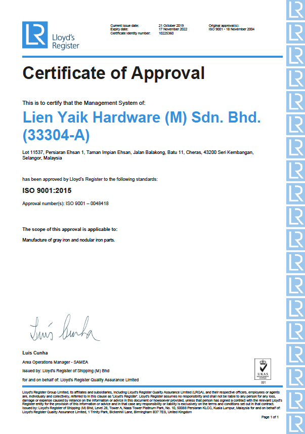 We specialise in the manufacturing of all kinds of Gray Cast Iron from Grade ISO 185/JL/150 to ISO 185/JL/250 and Spheroidal Graphite Cast Iron (Nodula Cast Iron) from Grade 400-18 to Grade 700-2. We sell and distribute our products as wholesale throughout Malaysia, Brunei, Middle East and all over the ASEAN countries. We were awarded the coveted ISO 9001 & 14001 Quality Management System through the upgrading of our facilities with a full Induction Furnace and Automated Moulding system. We are also proud to announce that we have recently in 2017, been awarded the Malaysian Brand award, which is an endorsement of quality from the Malaysian government. |